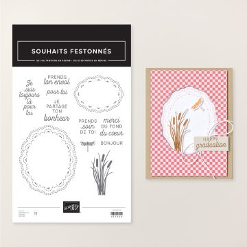Créez d’élégantes cartes artisanales pour n’importe quelle occasion avec le set de tampons Souhaits festonnés. Il suffit de tamponner votre souhait dans un cadre décoratif festonné pour un look sophistiqué et intemporel. Ce set de tampons est une option polyvalente à avoir sous la main pour des remises de diplômes, des remerciements, des vœux de réconfort et plus encore !